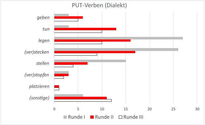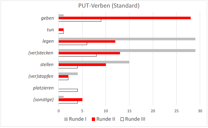Auf welche Versprachlichungsstrategien greifen SprecherInnen des Deutschen in Österreich zur Verbalisierung von PUT-Aktionen zurück? Welche Kandidaten für basale PUT-Verben lassen sich herausarbeiten, und in welchem quasi-synonymischen Verhältnis stehen diese (potentiellen) Basisverben zu Spezifizierungsverben der zielorientierten Objektsbewegung?