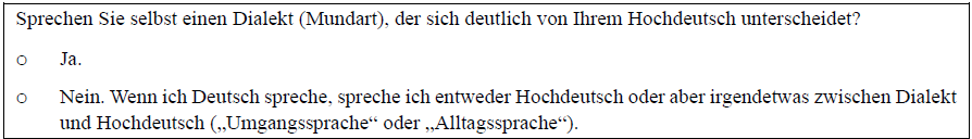 „Wahl“ der jeweiligen Fragebogenvariante pro Gewährsperson erfolgt implizit durch eine Einstiegsfrage zu Beginn des Fragebogens (siehe (6)). Durch Anklicken von Ja als Antwort zur Frage „Sprechen Sie selbst einen Dialekt (Mundart), der sich deutlich von Ihrem Hochdeutsch unterscheidet?“ wird die Person zum Fragebogentyp D-HD weitergeleitet, ansonsten zum Typ UGS-HD.