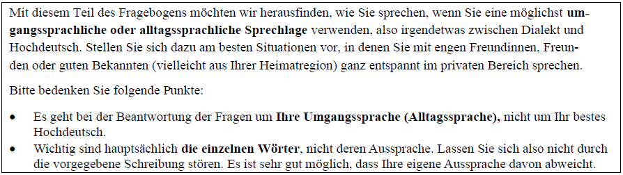 In beiden Registerteilen eines Fragebogens kommen jeweils drei Aufgaben zur Verbalisierung von PUT-Aktionen zum Einsatz, sodass zum nonstandardsprachlichen (dialektal bzw. „umgangssprachlich“) wie standardsprachlichen Register jeder Gewährsperson Daten von jeweils drei Aufgaben vorliegen. Inhalte und Aufbau der Aufgaben sind registerübergreifend weitgehend ident. Registerspezifische Unterschiede beschränken sich lediglich auf die explizit in der Aufgabenstellung gewünschte Sprechlage, einmal „Dialekt“ bzw. „Umgangssprache“ und einmal „bestes Hochdeutsch“. Die jeweils anvisierte Sprechlage wird zu Beginn des entsprechenden Fragebogenteils paraphrasiert und kontextuell eingebettet.7 Exemplarisch ist in (7) die Einleitung des „umgangssprachlichen“ Fragebogenteils einzusehen.