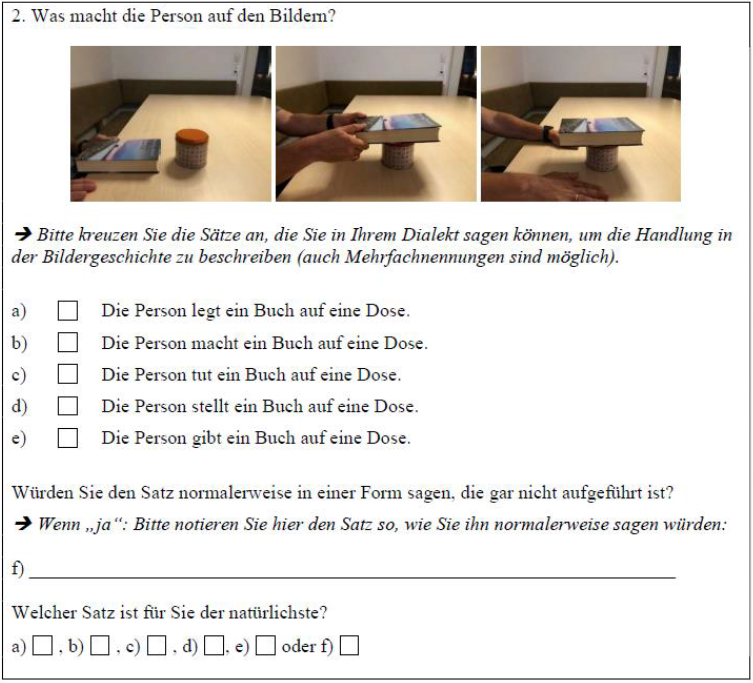 Die ebenfalls eingesetzte Kombinationsaufgabe in Abbildung 5 stellt eine Mischung aus Bildsequenzbeschreibung und Bewertungsaufgabe dar, bei der die Bildsequenz durch eine Auswahl an vorgegebenen Varianten ergänzt wird. Wie bei der reinen Bildsequenzbeschreibung (cf. Abbildung 4) steht es den Gewährspersonen aber frei, eine zusätzliche und freie Antwort den Auswahlvarianten hinzuzufügen.9 Bei der in Abbildung 5 dargestellten Aufgabe werden neben den beiden Basisverben geben und tun auch die Spezifizierungsverben legen und stellen bzw. das Basisverb machen als Varianten angeboten (zu letzterem cf. auch die Wenker-Daten in Lenz et al. 2021: Karte 2). Die Erwartung, die der Konzeption dieser Aufgabe zugrunde lag, war, dass in jedem Fall das Verb legen für die meisten Gewährspersonen ohnehin ein mögliches Spezifizierungsverb zur Aktionsverbalisierung darstellen sollte, da das bewegte Buch in liegender und nicht stehender Position auf einer Dose positioniert wird.
