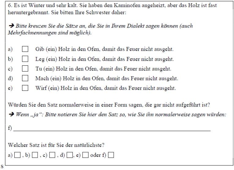 Abbildung 6 beinhaltet die dritte Aufgabe des Fragebogens im Hinblick auf PUT-Verben. Sie stellt eine klassische Bewertungsaufgabe (per Ankreuzen) dar, wobei auch hier die Möglichkeit der Angabe einer freien Alternativantwort gegeben wird (zum Aufgabentyp siehe Fleischer/Kasper/Lenz 2012; Lenz 2016). Inhaltlich ist die perspektivierte Objektsbewegung Holz in Ofen an den Wenkersatz 3 angelehnt. Die Auswahl der vorgegebenen PUT-Verben in der Fragebogen-Aufgabe orientiert sich entsprechend an den realisierten Verben der Wenker-Fragebögen.10 Neben den Basisverben geben und tun sind die Verben legen, machen und werfen als Alternativen in die Vorauswahl aufgenommen.