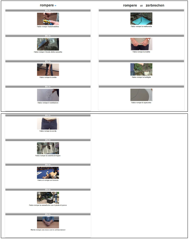 Dazu wurde eine Onlineerhebung erstellt, in der 20 Szenen der Klassen Modification of the object und Setting relation among objects aus IMAGACT als Stimuli dienten und die Teilnehmer gebeten wurden, auf die Frage „Was tut die Person im Video?“ mit einem kurzen Satz zu antworten. 105 deutschund italienischsprachige Personen haben an der Erhebung teilgenommen und die ersten Auswertungen scheinen die Hypothese zu bestätigen.
