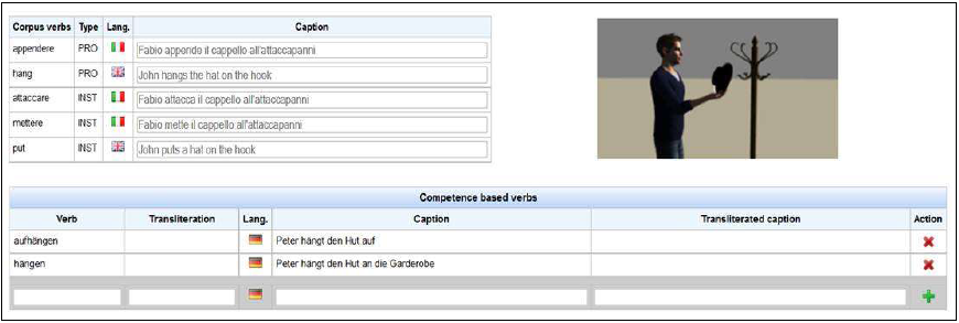 Anzugeben sind für jede Aktion das passende Verb bzw. die passenden Verben in der Nennform sowie ein caption genannter Beispielsatz in der 3. Pers. Sg., in dem alle thematischen Rollen besetzt sind. Für Sprachen, die nicht das lateinische Alphabet verwenden, ist außerdem eine Transliteration einzutragen.5