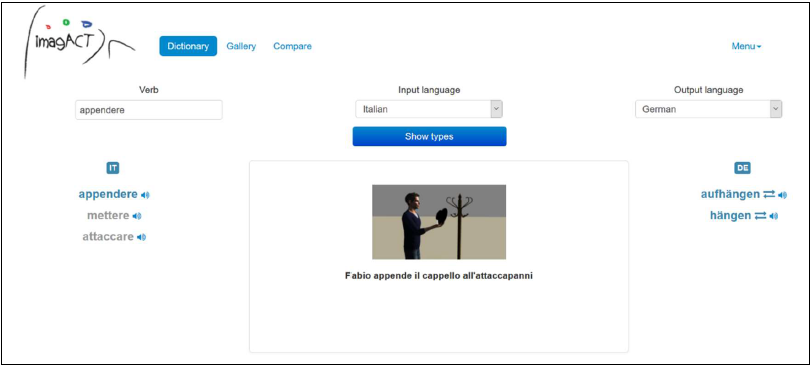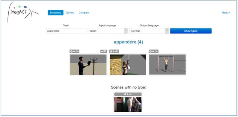 Soll IMAGACT als zweisprachiges Wörterbuch verwendet werden, wählt der Nutzer in der oben abgebildeten Oberfläche die Ausgangssprache aus und gibt ein Verb ein, z. B. das italienische appendere, auf das er bei der Übersetzung des Satzes La ragazza appende la sciarpa all’attaccapanni gestoßen ist. Als erstes Suchergebnis erhält er die in Abbildung 3 dargestellte Seite, wo er die Zielsprache wählen kann und wo die verschiedenen Lesarten des Verbs, dargestellt durch prototypische Szenen der Verbalhandlung, visualisiert sind.
