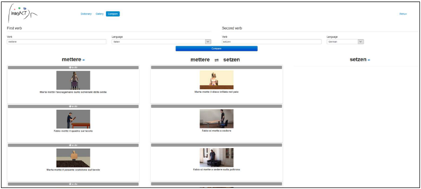 Die Funktion Compare erlaubt es, zu vergleichen, wo sich die Referenz von zwei Verben überschneidet und wo hingegen ein Verb gegenüber dem anderen eine geringere Extension hat. In die Suchmaske können entweder zwei Verben einer Sprache zum innerlingualen Vergleich oder zwei Verben, bei denen eine Äquivalenzrelation vermutet wird, aus zwei Sprachen eingegeben werden. In der Mitte sieht man die Szenen, auf die beide Verben referieren können, links und rechts diejenigen, auf die jeweils nur eines der Verben referiert. So kann der Nutzer im unten dargestellten Beispiel erfahren, dass die Referenz des italienischen mettere sehr viel weiter ist als die des deutschen setzen. Gerade dem Anfänger kann die direkte Gegenüberstellung helfen, die Regeln für den Gebrauch der deutschen Positionierungsverben zu erwerben.