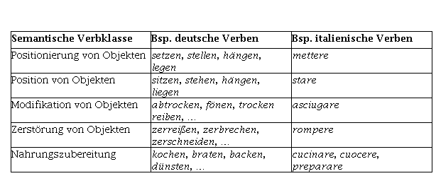 Das Modell von Talmy ist stark rezipiert und von mehreren Autoren und Forschungsgruppen adaptiert und erweitert worden (cf. insbesondere die Arbeiten von Slobin, z. B. 2004, und auch den Sammelband von Goschler/Stefanowitsch 2013). Die Adaption des Modells durch die TYPOlex-Gruppe besteht in seiner Ausweitung auf andere semantische Verbklassen. Ein wichtiger Aspekt dabei ist, dass die MANNER-Komponente in den germanischen Sprachen auch in anderen Klassen schwer zu unterdrücken scheint, wie untenstehende Tabelle zeigt. Während das Deutsche auch für Verben, die z. B. die Positionierung, die Position, die Modifikation und die Zerstörung von Gegenständen sowie die Nahrungszubereitung ausdrücken, diese Komponente beinhalten, also expliziert, wie die jeweilige Veränderung zustande kommt, verwendet das Italienische die erwähnten generischen Verben, die gerade durch das Fehlen der MANNERKomponente charakterisiert sind (cf. Korzen 2018: 20, mit Referenz auf eine mündliche Information durch Alessandro Panunzi). Die Wahl des Verbs im Deutschen hängt von mehreren Faktoren ab, die auch die Qualität seiner Argumente betreffen – das Positionierungsverb stehenz. B. setzt als Subjekt eine Person, ein Tier mit Beinen oder einen Gegenstand aus hartem Material voraus –, und umgekehrt enthält das Verb stärkere Restriktionen für seine Argumente als ein generisches Verb.