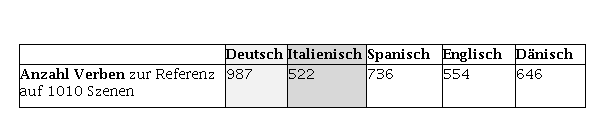 Die zitierten typologischen und korpusbasierten Studien der TYPOlex-Gruppe und anderer Autoren deuten darauf hin, dass exozentrische Sprachen wie das romanische Italienisch konkrete Aktionen bevorzugt durch wenige generische Verben ausdrücken, die auf eine Vielzahl von teils sehr unterschiedlichen Aktionen referieren können, während endozentrische Sprachen, zu denen das gemanische Deutsch gehört, spezielle Verben zur intensiven Referenz auf je nur eine oder wenige Aktionen präferieren. Die Daten aus IMAGACT können dies quantitativ belegen. Wie folgende Tabelle zeigt, sind für das fest definierte Set von 1010 Aktionen für das Deutsche 987 Verben eingegeben worden, während es für das Italienische lediglich 522 sind. Zum Vergleich enthält die Tabelle auch Daten für das Spanische, das Englische und das Dänische (Daten nach Alessandro Panunzi, cf. auch Korzen 2018: 20; Gärtig-Bressan 2019a: 35–36; Moneglia/Panunzi/Gregori 2018: 25).