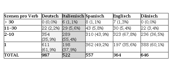 Tabelle 3 zeigt darüber hinaus, dass es im Italienischen einige Verben gibt, die auf mehr als 30 Aktionen referieren können. Solche Verben kennt das Deutsche nicht, und auch der Anteil von Verben, die 11–30 Szenen bezeichnen, sind im Vergleich zum Italienischen äußerst selten. Umgekehrt referieren 61,9% der deutschen Verben in der Datenbank auf lediglich eine Aktion. Eine solch enge Referenz haben im Italienischen lediglich 37,9% der Verben.
