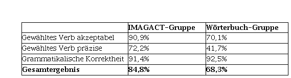 Die Teilnehmer wurden in zwei Gruppen geteilt, von denen eine das task mit IMAGACT, die andere mit einem traditionellen zweisprachigen Wörterbuch lösen konnte.6 Die Ergebnisse belegen, dass die IMAGACT-Gruppe für 90,9% der Sätze ein akzeptables Verb in der Zielsprache Deutsch wählte (z. B. öffnen oder aufmachen für aprire in Satz 3), während dies in der Wörterbuch-Gruppe nur in 70,1% der Fälle gelang. Ein treffendes, spezielles deutsches Verb, also etwa aufspannenfür Beispiel (3), wurde von den Teilnehmern der IMAGACTGruppe in 72,2% der Fälle gewählt, von den Teilnehmern der Wörterbuch-Gruppe lediglich in 41,7%. Anders als vermutet führten die fehlenden expliziten Grammatikangaben in IMAGACT kaum zu mehr Fehlern in diesem Bereich: Während entsprechende Fehlgriffe in der Wörterbuch-Gruppe in 7,5% der Fälle passierten, erfolgen sie in der Gruppe IMAGACT nur wenig häufiger (8,6%).