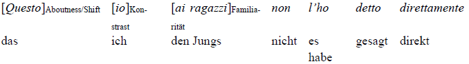 Ziehen wir den letzten Satz in Betracht, wo drei topikalisierte Konstituenten (questo, ‚das‘, io, ‚ich‘, ai ragazzi, ‚den Schülern‘) vorkommen, die jeweils zu drei verschiedenen Topiktypen gehören.