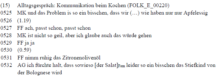 In dieser Sequenz bereiten die Teilnehmer einen Salat vor und machen dabei Kommentare dazu, wie sie ihn anmachen sollen. Der Referent „Salat“ steht also im Mittelpunkt der Konversation, sodass die Konstituente der Salat in LRM in Zeile 0532 als Familiaritätstopik eingestuft werden kann.