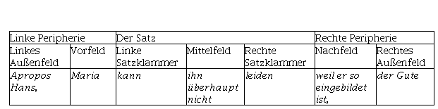 Das linke Außenfeld ist demgegenüber einer Konstituente vorbehalten, die syntaktisch vom Satz unabhängig ist und durch die der Sprecher ein Diskurstopik einführen kann, das heißt, das Thema des nachfolgenden Diskursabschnitts. Ein Beispiel dafür ist apropos Hans in Tabelle 1 oben (cf. Averintseva 2007). Sätze, in welchen beide Positionen der deutschen linken Peripherie besetzt sind, gelten als Verletzungen der Verb-Zweit-Regel. Wie es schon in Altmann (1981) gezeigt wurde, ist die mehrfache Besetzung der linken Peripherie extrem häufig im gesprochenen Deutschen, wobei immer eine syntaktisch nicht integrierte Konstituente vor einer integrierten Konstituente auftritt, wie beim Satz in Tabelle 1.