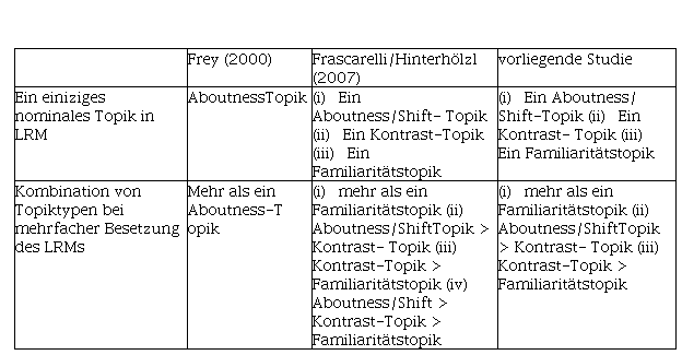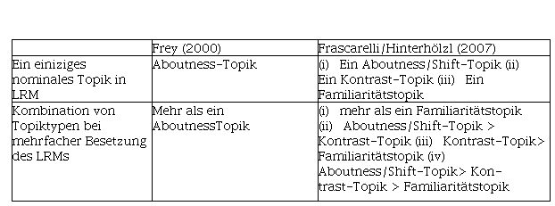 In folgender Tabelle werden die Hypothesen zur Besetzung des LRMs nach Frey (2000) und Frascarelli/Hinterhölzl (2007) gegenübergestellt: