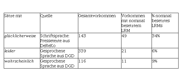 Von den 143 Sätzen mit glücklicherweise aus den schriftlichen Daten aus dem DeReKo weisen 49 einen mit nominal besetztem LRM auf. In den gesprochen-sprachlichen Daten aus FOLK ist der LRM nur in wenigen Fällen nominal besetzt, und zwar: von den 339 Sätzen mit leider haben 21 einen nominal besetzen LRM; von den 116 Sätzen mit wahrscheinlich weisen nur 11 einen nominal besetzten LRM auf. Tabelle 3 fasst die Daten zusammen: