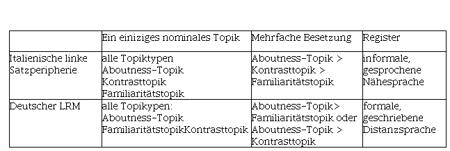 Schließlich konnten wir feststellen, dass im Deutschen der LRM vor allem in den schriflichen Daten der Pressetexte genutzt wird, während der LRM in gesprochen-sprachlichen Daten – wenn überhaupt – nur mit einem einzigen nominalen Topik und nie mit mehr als einem Topik besetzt wird. Die mehrfache Besetzung des LRMs ist also in unseren Daten nur in den Pressetexten und nicht in den Gesprächen aus FOLK belegt. Dies scheint dafür zu sprechen, dass im Deutschen die Besetzung des LRMs mit nominalen Konstituenten ein Kennzeichen distanzsprachlicher Texte darstellt. Dies steht im Gegensatz zur Besetzung der italienischen linken Satzperipherie durch nominale topikalisierte Konstituenten, die typisch für informelle, NäheSprache ist. Dies bedeutet, dass sich der LRM des Deutschen und die linke Satzperipherie des Italienischen im Hinblick auf das Register unterscheiden bzw. einander nicht entsprechen.