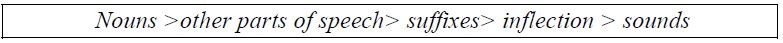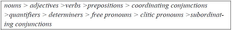 The foregrounding of a noun is confirmed by subsequent models (e. g. Muysken 1981). But the lumping of all other parts of speech together is questionable. It suggests that there are two “parts of speech”: noun and the others, which of course has no empirical or theoretical support. Interestingly, this limitation in Haugen (1950) is catered for by Muysken (1981), who provided a hierarchy of borrowing based on his analysis of Spanish borrowings in Quechua (see Figure 2).