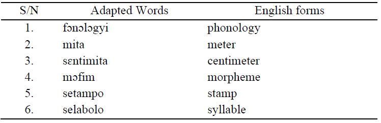 Adaptation of borrowed lexical items is the process of making English conform to Twi orthography and its phonology. Accordingly, some of the loanwords found in the textbooks were completely changed to suit the graphological and phonological norms of Asante Twi. The process is also referred to as substitution such that the words undergo a norm maintaining process, to be appropriated into the Asante Twi environment. In this sense, the norms of the Asante Twi concerning the orthography and/or the phonology of the loanwords were upheld. Examples of these adapted words are as shown in Table 1.