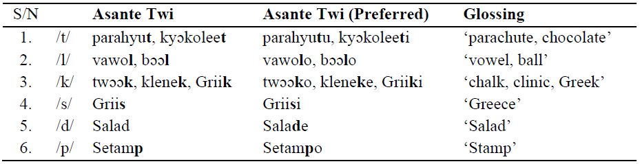 Asante Twi phonology would have required that a word that ends in a consonant in English is rather ended with a vowel in the language as in the “preferred” cases indicated in Table 2. However, what we found in the books is the consonant-final case and this is a transplantation from English into Asante Twi.