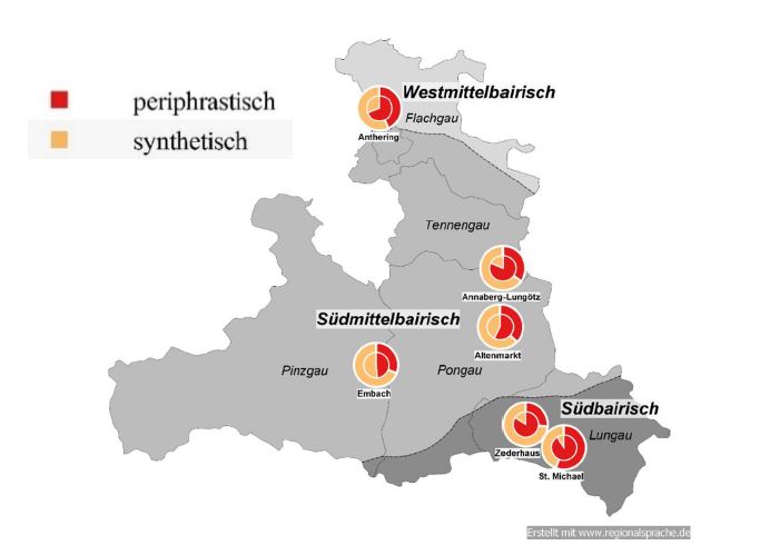 Zwar gibt es Unterschiede zwischen den einzelnen Orten, diese lassen sich aber kaum auf die Dialektgrenzen zwischen dem Süd-, Südmittel- und Mittelbairischen (nach Wiesinger 1983) zurückführen (cf. für ein ähnliches Ergebnis Vergeiner/Bülow 2022). Einzelne Unterschiede zwischen den Untersuchungsorten können eher mit soziodemographischen Faktoren erklärt werden: So fällt auf, dass nur im Pinzgauer Untersuchungsort Embach bei den Partikelverben mit 51,6% (n = 48) synthetische Varianten gegenüber periphrastischen dominieren. Mit weniger als 610 Einwohnerinnen ist das Bergdorf Embach der einwohnerschwächste Untersu- chungsort dieser Studie, der zusätzlich besonders verkehrsabgeschieden ist. Dass hier sogar unter den Partikelverben synthetische Formen knapp vor periphrastischen überwiegen, dürfte dem sprachlichem Konservativismus des Ortes geschuldet sein. In St. Michael im Lungau wur- den sowohl bei den einfachen Verben als auch bei den Partikelverben von allen Untersuchung- sorten am häufigsten periphrastische Formen dokumentiert. Eine sehr gute Verkehrsanbindung (A10 Tauernautobahn, B96, B99) könnte ein Grund für die starke Präferenz der innovativen periphrastischen Formen sein. Zudem ist St. Michael, nach Einwohner*innen gemessen, die zweitgrößte Gemeinde im Lungau.