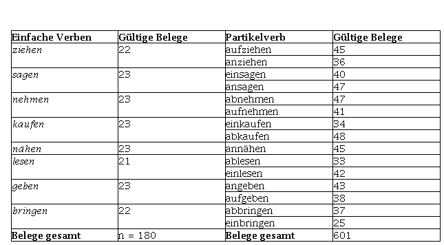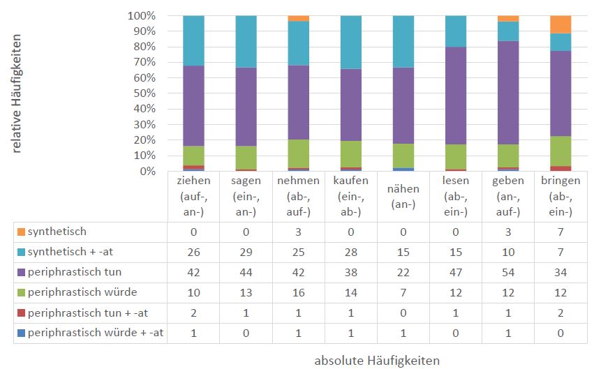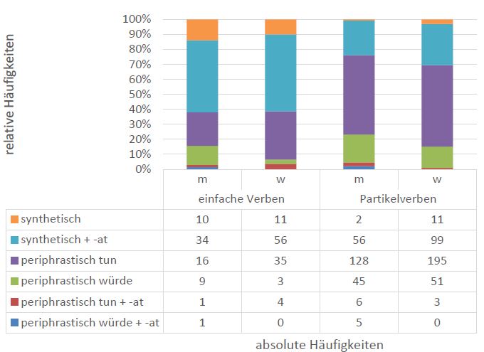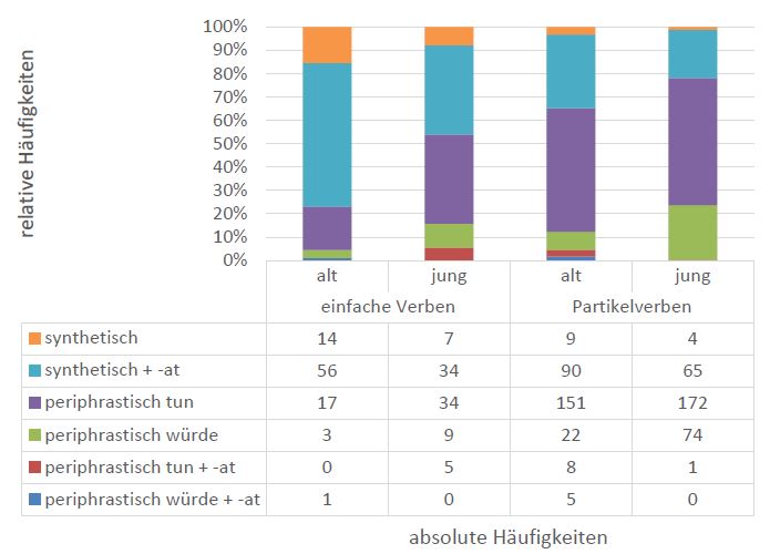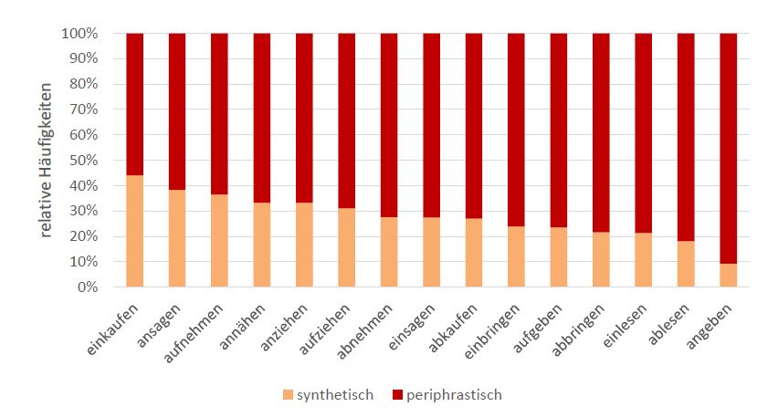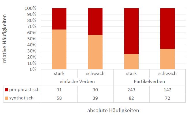 Im Vergleich zwischen den einfachen Verben und den Partikelverben zeichnet sich somit ein auffälliger Unterschied zwischen dem synthetischen und periphrastischen Bildungstyp ab: Während bei den einfachen Verben synthetische Formen dominieren, überwiegen periphrasti- sche Varianten bei den Partikelverben.