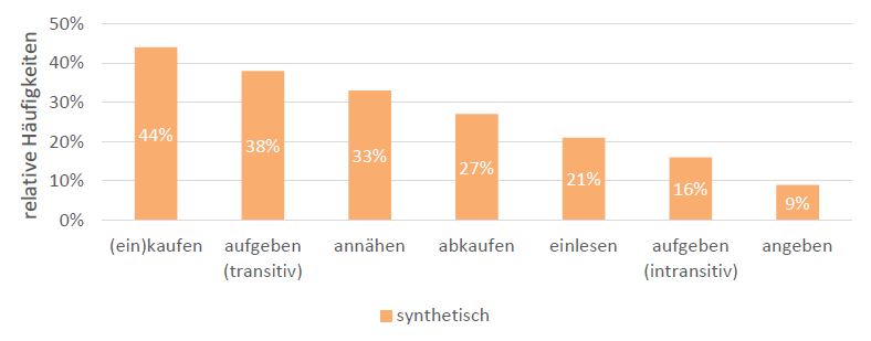 In Kapitel 4.2 wurde beschrieben, dass es auch auffällige verbspezifische Unterschiede zwi- schen Partikelverben mit demselben Basisverb gibt. Um diese Unterschiede zu erklären müssen syntaktische und semantische Faktoren berücksichtigt werden. Dies wird in weiterer Folge exemplarisch für die Partikelverben aufgeben (trans.), aufgeben (intrans.), (ein)kaufen, annähen, abkaufen, einlesen und angeben diskutiert. Abbildung 13 zeigt, wie häufig bei diesen Verben jeweils synthetische Varianten erscheinen.