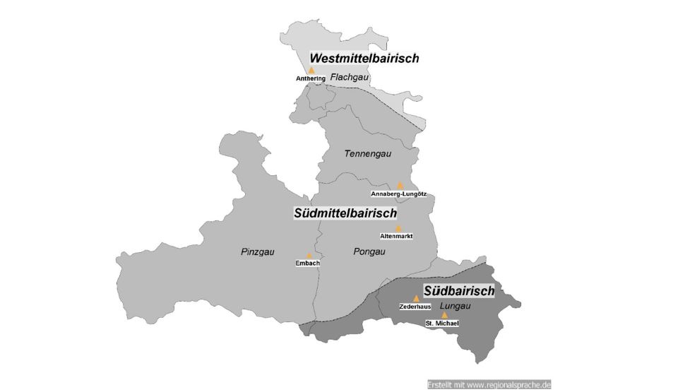 Das Untersuchungsgebiet umfasst das Bundesland Salzburg, das mit dem Westmittelbairischen (im nördlichen Flachgau), dem südmittelbairischen Übergangsgebiet (im südlichen Flachgau sowie dem Tennengau, Pongau und Pinzgau) und dem Südbairischen (im Lungau) von drei größeren Dialektarealen durchzogen wird (cf. Wiesinger 1983). Die sechs Untersuchungsorte der vorliegenden Studie sind entsprechend der Größe dieser Dialektgebiete im Bundesland Salzburg verteilt: Für das Westmittelbairische wurden in einem Untersuchungsort Daten erho- ben, das Südmittelbairische ist durch drei und das Südbairische durch zwei Erhebungsorte re- präsentiert. Abbildung 1 zeigt die Untersuchungsorte und ihre Lage sowohl in den Bezirken als auch in den Dialektarealen.