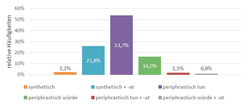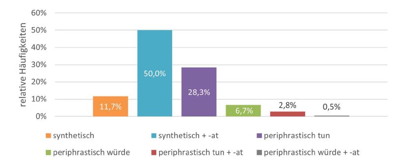 Insgesamt sind synthetische Varianten (n = 111; entspricht 61,7%) bei den einfachen Verben häufiger belegt als periphrastische Varianten (n = 69; entspricht 38,3%). Unter den syntheti- schen Varianten dominiert die Form mit -at-Suffix deutlich gegenüber der Variante ohne -at. Eine klare Präferenz für die Form mit tun-Auxiliar ohne -at-Suffix ist unter den periphrasti- schen Varianten erkennbar; die einfache würde-Periphrase sowie hybride Varianten mit Au- xiliar + -at sind deutlich seltener dokumentiert (siehe Abbildung 4).