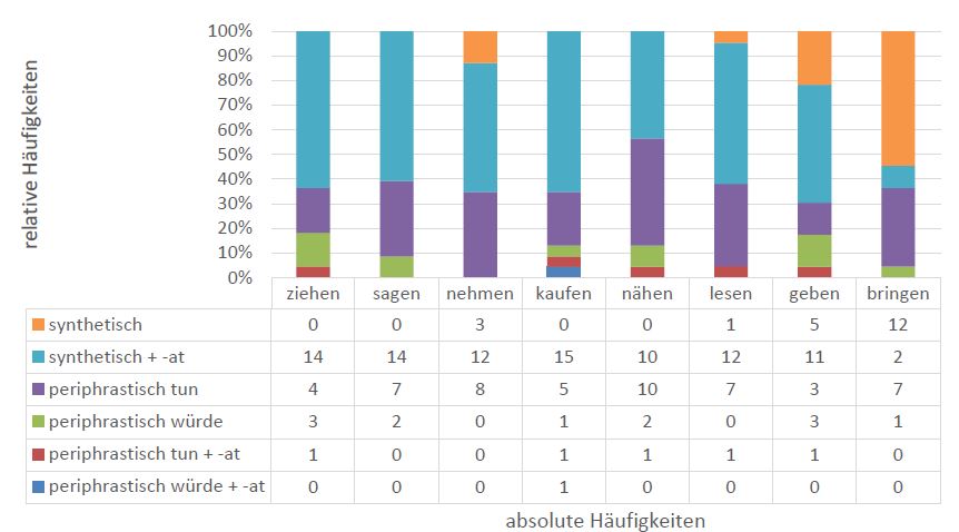 Bei sieben der acht untersuchten einfachen Verben überwiegen synthetische Formen, nur nähen erscheint häufiger mit periphrastischen Formen. In der Studie von Vergeiner/Bülow (2022) zeichnet sich bei den Verben ziehen, sagen, nehmen und kaufen im Bundesland Salzburg eine Präferenz für die synthetische Variante mit -at-Suffix ab, welche in dieser Studie bestätigt wer- den kann. Für die Verben nähen und lesen dokumentieren Vergeiner/Bülow (2022) eine ver- stärkte Tendenz zur periphrastischen Form mit tun-Auxiliar ohne -at-Suffix, wobei im Bundes- land Salzburg auch bei diesen Verben etwas häufiger als in den meisten anderen Bundesländern die synthetische Variante mit -at-Suffix verwendet wird. Eine Tendenz zu periphrastischen For- men ist in dieser Studie bei nähen, nicht aber bei lesen erkennbar.