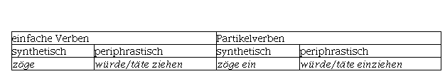 Tabelle 2 fasst die synthetischen und periphrastischen Varianten der Konjunktiv-II-Bildung für einfache Verben und Partikelverben zusammen: