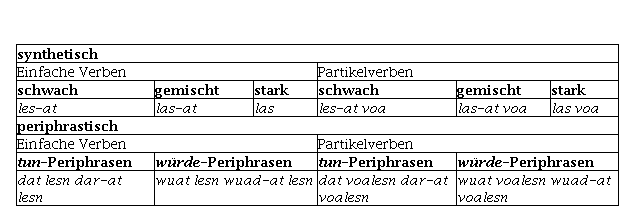 Periphrastische Varianten werden entweder mit tun- oder würde-Auxiliar gebildet (z. B. i dat lesn). Daneben existieren periphrastische Hybridformen mit tun- oder würde-Auxiliar und -at- Suffix (z. B. i darat lesn). Im Falle der periphrastischen Konjunktiv-II-Bildung stehen Verb- partikel und Basisverb in morphologischer Kontaktstellung.