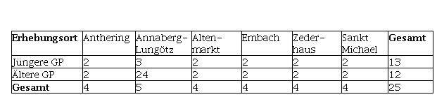 Tabelle 3 fasst das Gewährspersonensample nach Ortspunkt und Altersgruppe zusammen. In jedem Ort wurden mindestens vier Gewährspersonen (GP) befragt, jeweils zwei jüngere (18– 31 Jahre; Ø = 25 Jahre, SD = 4,4 Jahre) und zwei ältere (60+ Jahre; Ø = 68 Jahre, SD = 7,1 Jahre). Von den 25 GP sind 15 weiblich und zehn männlich. Zwanzig GP haben keine Matura wobei zwölf einen Pflichtschul- oder Lehrabschluss und acht eine berufsbildende Schule ohne Matura als höchste abgeschlossene Ausbildung angegeben haben.