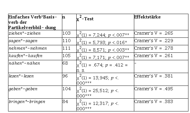 Zwischen den einfachen Verben und den Basen der Partikelverben (-)ziehen, (-)sagen, (-)neh- men und (-)kaufen zeigt sich ein schwacher statistischer Zusammenhang hinsichtlich des Ge- brauchs synthetischer und periphrastischer Konjunktiv-II-Formen (Cramer’s V < 0,3). Einen mittleren Effekt ergibt die Berechnung der Effektstärke beim Vergleich der einfachen Verben lesen, bringen und geben mit den Basisverben (-)lesen, (-)bringen und (-)geben (Cramer’s V < 0,5).