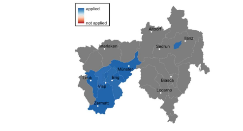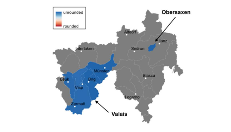 Figure 2 shows the unrounding of [y] to [i] in Rücken. The map reveals parallels between Valais and Obersaxen: in both regions, participants indicated the unrounded variant (blue), leading to homogenous results for the entire canton of Valais (98.7% unrounded, 1.3% rounded) and Obersaxen (100% unrounded).