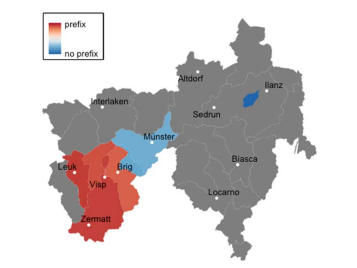The two morphological variables demonstrate great variation between the two regions. Prefixation using ver- is known and common in most of Valais. In Obersaxen, a majority of informants are still familiar with the ver- variant (69.44%), but it is less common than in the canton of Valais. A chi-square-test of independence revealed a significant effect [χ²(2)= 86.167, p < 0.001]. A logistic regression (glm) further revealed that younger people in Obersaxen are less likely to be familiar with the variant ver- than older people [Est. = 0.05790, z = 2.751, p < 0.01]. The past participle circumfix, as in gebastelt, shows inter- as well as intra-regional variation. The prefix ge- is widely found in the western part of Valais but much less so in the easternmost part; it is completely absent in Obersaxen (see Figure. 4). The relative distributions between Obersaxen and the Valais were significantly different (chi-squared test of independence with simulated p-value) [χ² = 165.05, p < 0.001].