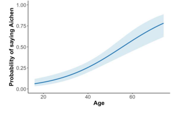 The greatest difference between Obersaxen and the canton of Valais was found in the lexical variable examined. Nearly all participants from Obersaxen indicated the variant Britschi, which is unknown to the people from Valais; in Valais speakers mainly indicated the variants Butter or Aichen. When looking at age in Valais, younger participants tend to disfavour Aichen and opt for Butter instead (glm, [Est. = 0.06905, z = 5.735, p < 0.001]) (see Figure 5).