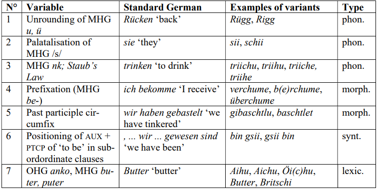 Seven variables (see Table 1) were selected based on comparability and typicality. We could directly compare contemporary distributions of these variables with those recorded in the SDS. We focused on variables that are identical in the two regions and perceived to be most typical to the southernmost dialects spoken in German-speaking Switzerland, including Valais and Obersaxen.