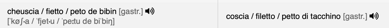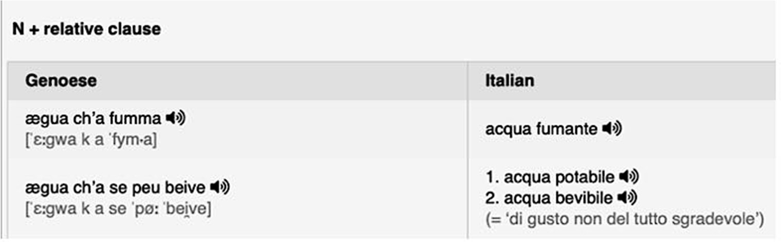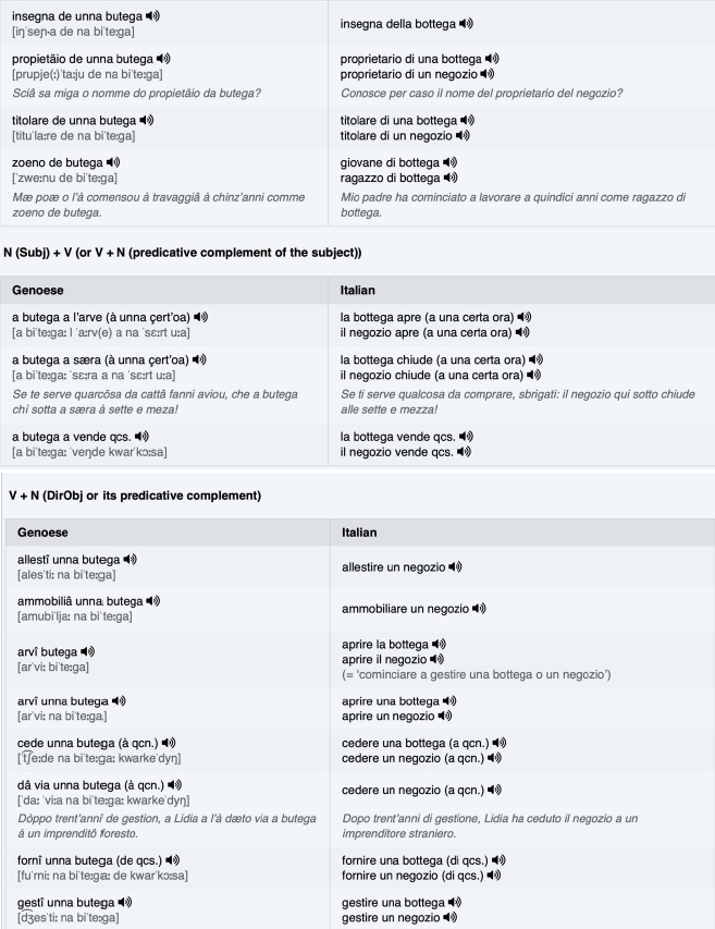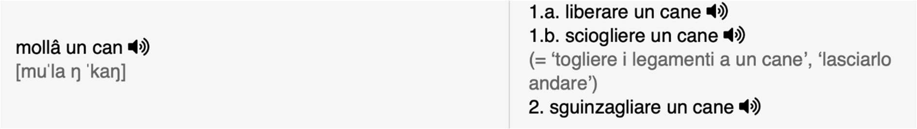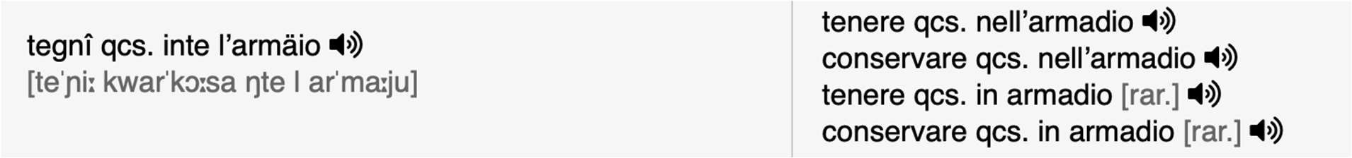 Wie bereits erwähnt, wurde für das Genuesische die städtische Variante gewählt. Das Projekt enthält Audiodateien der Phraseme, die auch Phänomene der Phonotaxis berücksichtigen. Es sollte jedoch nicht vergessen werden, dass einige SprecherInnen langsamer sprechen und andere mehr dazu neigen, die Wörter in der Rede zu „verbinden“. Aus diesem Grund beziehen sich die phonetischen IPA-Transkriptionen nicht nur auf die zugehörige Audiodatei, sondern zeigen z. T. verschiedene Varianten, die in der städtischen Variante des Genuesischen möglich sind.11 Die Audiodateien wurden im MP3-Format hochgeladen, damit sie von möglichst vielen Geräten erkannt werden können.