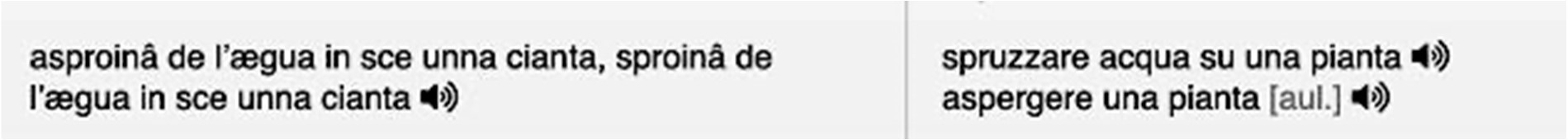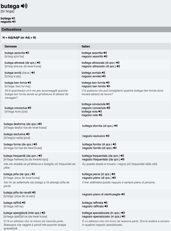 Insgesamt weisen genuesische Wörterbücher immer noch eine relativ geringe Anzahl von Lemmata auf. Oft fehlen phonetische Transkriptionen oder die Möglichkeit, sich diese per Audiofunktion vorsprechen zu lassen; zudem sind sie arm an Beispielsätzen.5 Im Gegensatz zu vielen populären Sammlungen (wie z. B. Dolcino 1975 und 2019; De Carlo 1994; Fochesato 1996a, 1996b, 2004, 2005a, b und 2006; Schiaffino 2000 und Pallotti 2016) meiden sie meist auch die Dokumentation von volkssprachlichen Phrasemen. Wie weiter unten zu sehen sein wird, versuchen GEPHRAS und GEPHRAS2, diese Aspekte zu berücksichtigen, und zielen in diesem Sinne auf eine vollständigere wissenschaftliche Erschließung des phaseologischen Materials ab