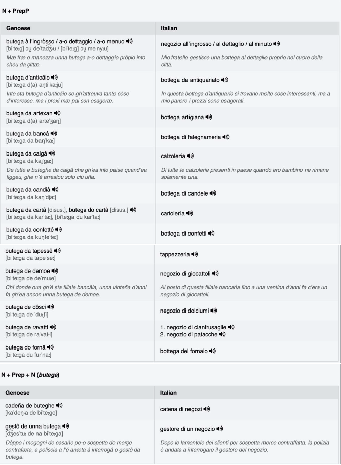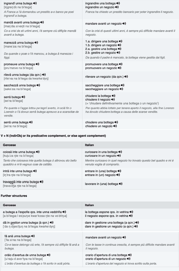 Das für die Entsprechungen der genuesischen Phraseme gewählte Italienisch ist ein Standarditalienisch, das natürlich je nach Register variiert. Was die Audiodateien betrifft, so enthalten sie die italienischen Phraseme, die nach den allgemeinen Regeln der Diktion wiedergegeben werden, während die vereinfachenden Phrasen authentische Beispiele zeigen und mit der Prosodie des regionalen ligurischen Italienisch ausgesprochen werden (siehe Kapitel 2.1.7 für weitere Informationen).