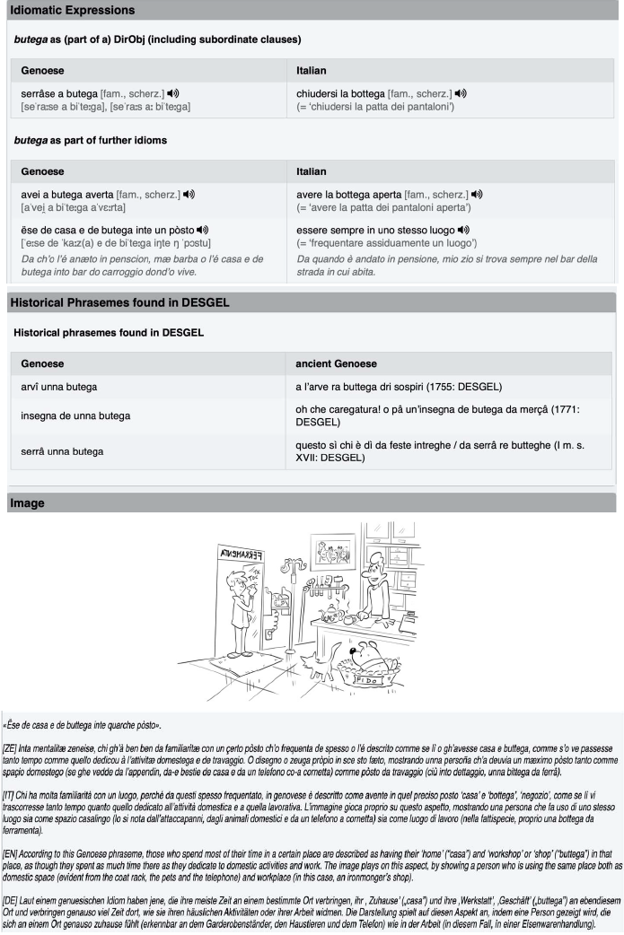 Dokumentiert sind auch die historischen Phraseme, die in DESGEL (Toso i. V.) zu finden sind und neben die heutigen Phraseme gestellt werden, mit der Indikation der Epoche laut DESGEL (cf. Toso i. Dr.). Auf den nächsten Seiten folgt ein Beispiel aus dem Lemma butega des GEPHRAS-Wörterbuchs.