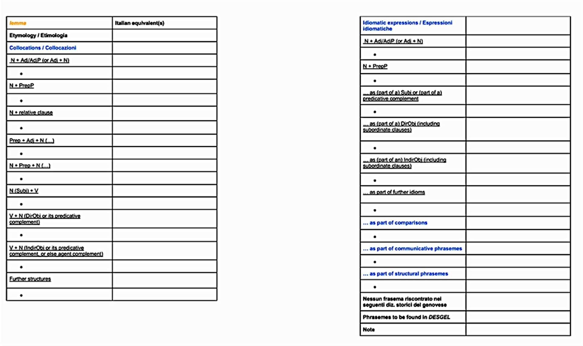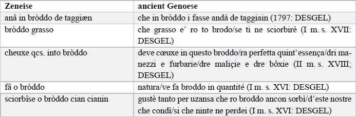 Sowohl Kollokationen als auch idiomatische Redewendungen werden in morphosyntaktische Kategorien unterteilt7 und anschließend alphabetisch geordnet. Die Nachschlagrichtung ist immer Genuesisch-Italienisch, i. e. ausgehend von der genuesischen Phraseologie wird nach den exakten und funktionalen Äquivalenten im Italienischen gesucht. In einigen wenigen Fällen sind jedoch Paraphrasen notwendig, und die Äquivalente sind nicht immer polylexikalisch, wie in ægua ciolla.brodaglia (= ‚lange und fade Brühe‘).