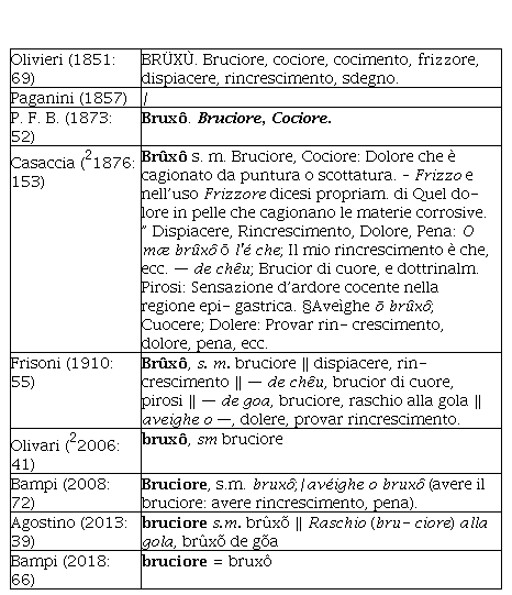Im Folgenden finden sich zunächst einige Beispiele zu dem Lemma bruxô.bruciore (‚Brennen‘) aus verschiedenen genuesischen Wörterbüchern. Alle Hervorhebungen wurden so übernom- men, wie sie im Original auftreten.