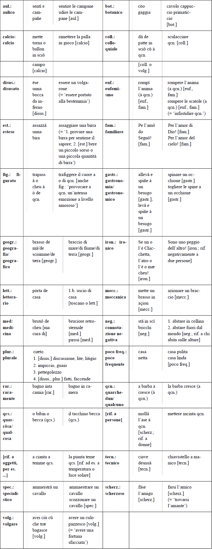Die Ergebnisse der Projekte GEPHRAS und GEPHRAS2 sind zu einem einzigen Wörterbuch vereinigt (cf. Autelli 2018–2021 und i. V.).6 Die für das Wörterbuch gewählte diatopische Varietät deckt sich mit dem städtischen Genuesisch, das in den meisten Merkmalen etwa zwischen Noli und Moneglia zu verorten ist (cf. Toso 1998: 24). Die Untersuchung muss derzeit auf eine Varietät beschränkt werden, denn wenngleich zwischen den verschiedenen ligurischen Dialekten große Ähnlichkeiten bestehen, variieren die Phraseme von Gebiet zu Gebiet leicht, und aus Zeit- und Ressourcengründen ist es unmöglich, alle ligurischen Varietäten und deren Nuancen zu dokumentieren. Da die städtische Variante auch in der Lexikographie die bekann- teste und dominanteste ist, fiel in den beiden Projekten die Entscheidung für diese Variante, wobei die bereits vorhandenen genuesischen Wörterbücher eine wichtige Informationsquelle für beide Projekte darstellen. Angesichts der Knappheit an relevantem Material in den bestehenden Repertorien werden jedoch auch populäre Sammlungen konsultiert und italienische Phraseme, die in Wörterbüchern oder Korpora (itTenTen16 und itTenTen20 auf Sketch Engine, cf. Kilgarriff et al. 2004) gefunden werden, übersetzt. Für das Genuesische ist die Frage nach öffentlich zugänglichen Korpora noch eher kritisch, aber das Projekt hat das Glück, auf die Daten von DESGEL (Toso i. V.) zugreifen zu können, das ligurische Texte von den Anfängen bis 1815 dokumentiert. Neben der Konsultation mehrerer Wörterbücher und genuesischer Sammlungen wurden darüber hinaus für umgangssprachliche Begriffe auch Recherchen auf mehreren Websites durchgeführt, insbesondere auf sozialen Medien wie Twitter und Facebook, und es wurden Videos auf Youtube und z. T. auch Liedtexte analysiert. GEPHRAS (2018–2021) und GEPHRAS2 (i. V.) enthalten mehrere metasprachliche Angaben, die regelmäßig aktualisiert werden. Nachfolgend findet sich eine tabellarische Auflistung der bisher übernommenen Abkürzungen, die sowohl Diaphasenzeichen als auch Valenzangaben betreffen, und daneben jeweils ein konkretes Beispiel (gen.-it.).