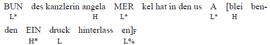 F markiert ist die am tiefsten eingebettete Konstituente des Verbs (bleibenden Eindruck), die eine befriedigende Antwort auf die vom Kontext eröffnete Frage {was hat Angela Merkel in den USA gemacht?} liefert. Sie weist einen fallenden Hochtonakzent auf. Auch in dieser IP kann man von einer Fokusbzw. Topikprojektion ausgehen. Der Fokus dehnt sich vom Exponenten Eindruck über die ganze Verbalphrase (bleibenden Eindruck hinterlassen) aus. Das Topik breitet sich vom Topikexponenten USA zur gesamten Präpositionalphrase (in den usA) aus. Somit wird die Äußerung hinsichtlich des Ortes näher bestimmt; allerdings sollte diese Ortsangabe einen Tieftonakzent erhalten, da sie zu der in IP 3 bereits eingeführten Phrase (im Weißen Haus) in enger Verbindung steht. Bundeskanzlerin weist hier nicht die Eigenschaften eines neuen Topiks auf, der die Mitteilungsabsicht verengen soll; es handelt sich vielmehr um ein altes Topik, der im Text schon mehrmals vorkommt und bei dem der Druckanstieg nichts anderes bedeutet als die Eröffnung der IP.