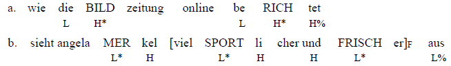 IP 8 besteht aus einem komplexen Satz, der einen vorangestellten, abhängigen Vergleichssatz (Wie die Bild Zeitung online berichtet…) und einen Hauptsatz (sieht Angela Merkel viel sportlicher und frischer aus) umfasst. Der prominenteste Akzent des Nebensatzes liegt auf dem rechten Klammerteil (berichtet) und wird von einem steigenden Grenzton gefolgt, was auf seine – neben syntaktischer auch – prosodische Abhängigkeit hinweist: Das Konnekt ist unbedingt in Bezug auf das zu interpretieren, was noch folgt. Der Hauptsatz beantwortet demnach die Kontextfrage {was berichtet die Bild Zeitung?}. Da die durch den Fokus kodierte Information (viel sportlicher und frischer) schon zum zweiten Mal vorkommt (cf. IP 4) und als gegeben vorausgesetzt werden kann, sollten hier die jeweiligen Tonhöhenakzente durch Tieftöne (L*) realisiert werden.