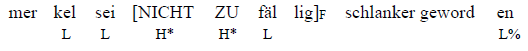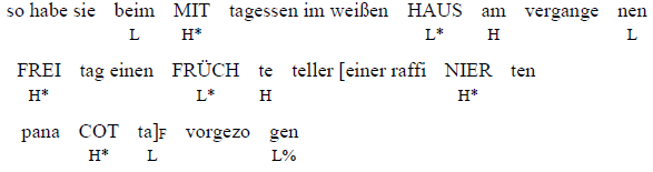 (23d) {Was hat Angela Merkel gemacht? } ich habe gehört, dass angela merkel [beim mittagessen einen FRÜCH\teteller bestellt]F – und nicht beim frühstück eine KÄ\sebretzel gekauft – hat.