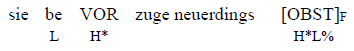 Diese Intonationsphrase schließt an die vorige an, indem die Gründe von Merkels Schlanksein bekannt gegeben werden. Der Satz ist als direkter Gegensatz zu zufällig zu verstehen und erfüllt die Funktion des im vorigen Satz nicht gegebenen sondern Anschlusses. Wenn man beide Sätze verbinden würde, könnte man auf einen ungefähr so aussehenden Satz stoßen: Sie ist nicht zufällig schlanker geworden, sondern sie bevorzugt neuerdings Obst. Der Fokusakzent liegt auf dem direkten Objekt (Obst), dessen kommunikative Funktion durch das mit Topikakzent markierte Verb (beVORzuge) verengt wird. Der steigende Akzent auf dem Verb dient dazu, die Informationserwartung auf eine bestimmte Einstellung (bevorzugen, hassen, lieben etc.) einzuschränken. Die logische kontextuelle Frage lautet hier {nicht zufällig ist sie schlanker geworden, sondern? Was hat sie gemacht, um schlanker zu werden?}, was zur weiteren Annahme führt, dass der Fokus über die ganze Intonationsphrase hinausprojiziert und die Ganzfokussierung der IP bedingt.