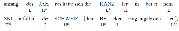 Mit diesem Satz zielt man darauf ab, über die Gründe Auskunft zu geben, die die Kanzlerin zum Abnehmen erzwungen haben. Die kontextuelle Frage, die das neue Thema ankündigt, sollte lauten {was ist der Grund für dieses Abnehmen? Was ist passiert?}. Der Fokusakzent fällt auf die erste Silbe des Wortes Beckenring und der Fokusbereich erstreckt sich über die ganze Verbalphrase, die die Informationserwartung befriedigt (den Beckenring angebrochen). Die Mitteilung wird anschließend mit zusätzlichen Informationen vervollständigt, die in Form von Topiks die Informationsgültigkeit zeitlich und lokal verengen. Bis auf Kanzlerin sollen hier alle Akzentsilben mit einem Hochton markiert werden, weil sie der Texthandlung neue Informationen hinzufügen.