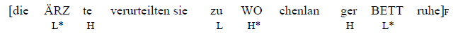 Im Abschlusssatz werden die Folgen des Unfalls bekanntgegeben: Angela Merkel muss wochenlang im Bett liegen. {Was hatte der Unfall als Folge?} ist die kontextuelle Frage, auf die diese letzte Intonationsphrase antwortet. Vom Fokusexponenten Bettruhe projiziert der Fokus auf die gesamte Verbergänzung (zu wochenlanger Bettruhe). Besonders prominent ausgesprochen wird hier das Attribut wochenlang, das die einzige wirklich neue Information der IP darstellt. Das Substantiv Bettruhe ist zwar Teil des Fokus, es kann aber problemlos auch durch einen Tieftonakzent realisiert werden: Nach einem Skisturz ist es schon plausibel anzunehmen, dass man eine Zeit lang zu Bettruhe verurteilt wird. Dasselbe gilt auch für das Subjekt (die Ärzte), das in dieser IP Topikfunktion erfüllt: Zwar wird dadurch die Gültigkeit des Fokus auf eine bestimmte Agens Gruppe eingeengt (Ärzte, Krankenschwestern, Sanitäter etc.), es ist aber durch eigenes Weltwissen weitaus erschließbar, dass diese Entscheidung von Ärzten oder sonstigen mit der medizinischen Welt handelnden Menschen getroffen wird, was letztendlich dazu führt, dass auch die hier enthaltene Akzentsilbe (ÄRZ) tief ausgesprochen bleiben kann.
