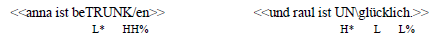 (34) zeigt insofern eine Harmonie, als sowohl syntaktische als auch prosodische Parataxe vorliegt: beide Aussagen sind sowohl syntaktisch als auch prosodisch gleichrangig. Der fallende Akzent auf betrunken und unglücklich ist dafür zuständig, dass beide Informationseinheiten als abgeschlossen und voneinander unabhängig sind. In (35) liegt syntaktische Parataxe aber prosodische Hypotaxe vor, denn der steigende Akzent bei betrunken signalisiert informatorische Unabgeschlossenheit. Das legt die Interpretation nahe, dass das Unglücklichsein von Paul damit zu tun hat, dass Ernia betrunken ist. In (36) liegt Hypotaxe sowohl auf syntaktischer als auch auf prosodischer Ebene vor. In (37) hingegen liegt syntaktische Hypotaxe aber prosodische Parataxe vor, i. e. dass die Abhängigkeit der ersten von der zweiten Information ausschließlich durch die Subordinierung des ersten Teilsatzes ausgedrückt wird. Offenbar reicht Parataxe auf einer der beiden Ausdrucksebenen aus, um die Interpretation nahe zu legen, dass die erste Aussage kommunikativ nicht unabhängig von der zweiten zu verstehen ist.